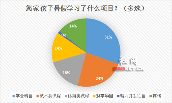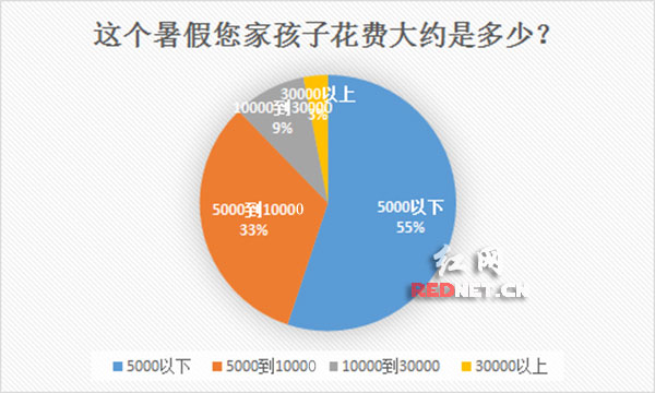 “您家孩子现在是什么年纪?”调查结果 “您家孩子暑假学习了什么项目?(可多选)”调查结果 “这个暑假您家孩子的花费大约多少?”调查结果 相关阅读: 【红贝网调查】晒一晒暑假账单 孩子假期花费要多少 红网长沙8月5日讯(时刻新闻记者 周丹)越来越多的家长觉得培养孩子的审美和素质十分重要,艺术培养要从小抓起、滴滴渗透。正值暑假黄金阶段,钢琴、古筝、舞蹈、绘画等等都是市面上热门的培训项目。养娃不易,漫长暑期,为了孩子掏点钱,家长们从来都很舍得。星城的家长们更乐意为孩子选择什么样的课程呢?这个假期花费要多少? 暑假时间已经过半,在红网教育频道与红贝网官方微信(公众号:edurednet)的调查显示,孩子三到六年级是兴趣爱好培养的黄金期;三成左右的家庭假期支出约5000,三成左右的家庭假期支出在5000~10000,也有一成左右的家庭开支在万元以上;项目多集中在学科培训、艺术类课程和体育类课程。 为了保持学习劲儿 开学好“收心” 雨花区的张女士是一位小学四年级学生的母亲。平日里,孩子除了要上英语口语班外,还要参加书法、机器人兴趣班,课余时间基本已经被占满。 暑假里,张女士选择了东塘附近一家知名培训机构,为女儿报了语文、数学、英语的课程班,花费在5000元左右。“暑假那么长,不上培训班坚持学习,开学就怕她落后啊!”张女士说,“我们选择的是普通班,如果是小班教学的VIP班级,价格可能要高出一倍。” 张女士表示:“今年是最严招生季,以后培训机构组织的培训和考试对升学是没有任何作用的。但我们工作比较忙,没时间带她,也没有时间辅她的功课。其实孩子的成绩还是不错的,给她报班也只是为了她能巩固之前的知识。” 像张女士这样的还有很多,“为了开学能收心、为了假期保持学习精神,”而为孩子选择了学科培训。 李小姐的弟弟正在芙蓉区一所学校上初二,“别的都还好,就是他的作文有点拉后腿,这不和几个同学一起报名了个作文班,让他去受下熏陶。”15次课的价格约为2000。 养个文艺娃不容易 家长费力拉团购 三年级的小天是个开朗活泼的孩子,按流行的话说就是个“文艺小暖男”,父母为了让他找到自己的兴趣爱好,为他选择了多个兴趣班。包括跆拳道、足球、乒乓球、钢琴、绘画、书法等等。 “他这个年纪是兴趣培养的黄金期,我们既想让他有一技之长,又想让他能找到自己真正喜欢的,因此采用的是‘广撒网’的方式。”小天妈妈说,这个暑假他有八门课程。每门兴趣课一周2到3次,两个月的假期被排的满满当当。 为了让小天能遇到好的启蒙老师,小天妈妈到处托人打听,上课的地点也在不一样的地方,家长需要辛劳接送。“为了孩子,这点花费算不得什么。” 不到四岁小朵精灵可爱,热情大方,这不幼儿园也放假了,经过仔细斟酌,朵妈为她选择了小主持人班和绘画班。 选择绘画是因为“朵朵喜欢画画”,每次都主动背着小画板、穿好鞋在门口等着,每天回来都会向家里人展示并讲解作品,“这个班是选对了,”朵妈开心地说,“正愁家里没人带,上午画画,下午手工课,16天共2500元。” 小主持人班的价格是398元,“这是我左策右策开起来的团购!市场价可不止啊!”朵妈大呼不容易,“我拉拉凑凑了十个人,一起报的班。这样既能省钱,又能为孩子找到可信任的玩伴和老师。” 特殊项目花费超高 国际游学渐升温 小杨是一名高二的学生,平常学业成绩并不理想。父母为他选择了一门艺术培训的编导班,一个月时间花费3.5万元。 “马上就要面临高考,学习不理想怎么办?我们也是无奈之举,高额花费选择了编导课程,他如果能学到些知识的话,今后或许可以从事相关方面的工作。”小杨父亲说。 和小杨一起上课的,还是七八个差不多情况的高中学生。然而,根据老师反馈情况和学习情况来看,小杨父亲的心愿和金钱可能要“打水漂”了。 澳洲、欧洲、亚洲……今年暑假,芙蓉区五年级苏同学的足迹又踏上了美国,圆了她的“迪士尼之梦”。父母均为教师,每年的寒暑假都是全家出游的好时机,苏同学的妈妈很认可“读万卷书行万里路”,她说:“很多家庭只能送孩子出游,而我们的家庭比较特殊,都是老师,能够陪伴孩子成长是很难得的,经过了多次出境游,她爸爸已经成为了自由行达人了!” “自助游能更加合理安排行程、控制花费,但毕竟是出境游,这次的美国之行费用预算是五万元。” 随着家长们观念的更新和出境游的火速发展,国外名校考察产品尤其受到家长追捧,美国、英国两国丰富的世界知名大学资源为家长所看重。今年特别火爆的英国游学,几乎游学团行程清单中都包含剑桥大学、牛津大学、大英博物馆等。 专家建议:合理安排 适当消费 暑假前,长沙市教育局下发了《关于认真做好学期结束工作和暑假活动安排的通知》,鼓励假期学生多多践行“行动德育”。 鼓励孩子走出校园,走进自然,深入社会,积极开展假期社会实践活动,在贴近学习和生活实际的情境中参与体验。同时鼓励学生走进农村,走进社区,走进企业,开展公益劳动、志愿服务、社会调查和素质拓展等综合实践活动。另外还需坚持体育锻炼,培养良好的体育锻炼习惯和健康的生活方式。 雨花区一位校长建议,暑假适当安排一些学习活动无可厚非,但是家长在选择兴趣班时,应该尊重孩子的意愿。要充分考虑孩子的兴趣和承受力出发