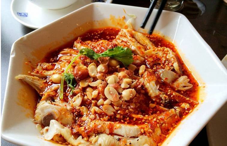 川西红的口水鸡很值得推荐。只选最嫩气清香的土公鸡,肌肉斩成块,在水即将烧开前,把葱姜料酒都加到锅里,水开后放入鸡肉煮10分钟。煮好的鸡要立刻放凉水,捞出后,再淋红油。鸡肉骨中带血且鲜嫩多汁,集麻辣鲜香嫩爽于一身。