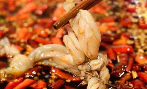 红油汤底熬好,再加入上好的花鲢鱼头继续熬煮,待花鲢鱼头熬出鲜香味后,再放入美蛙。几分钟后,蛙肉煮好再一起起锅,再放上葱段、优质花椒、辣椒,炝油等,美蛙个头很大,蛙肉很多,鱼头肥滑细嫩,美蛙细嫩入味,口味麻辣醇厚,回味悠长。