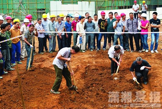 9月18日,在工地东北角,第三处古墓被发现了。长沙市考古研究所工作人员介绍,此处的土质、颜色与周边不同,在泥土中还发现了青砖碎片。工作人员推断,此处应当也有古墓,而且与第一处古墓为土坑墓不同,这一处古墓应为砖室墓。